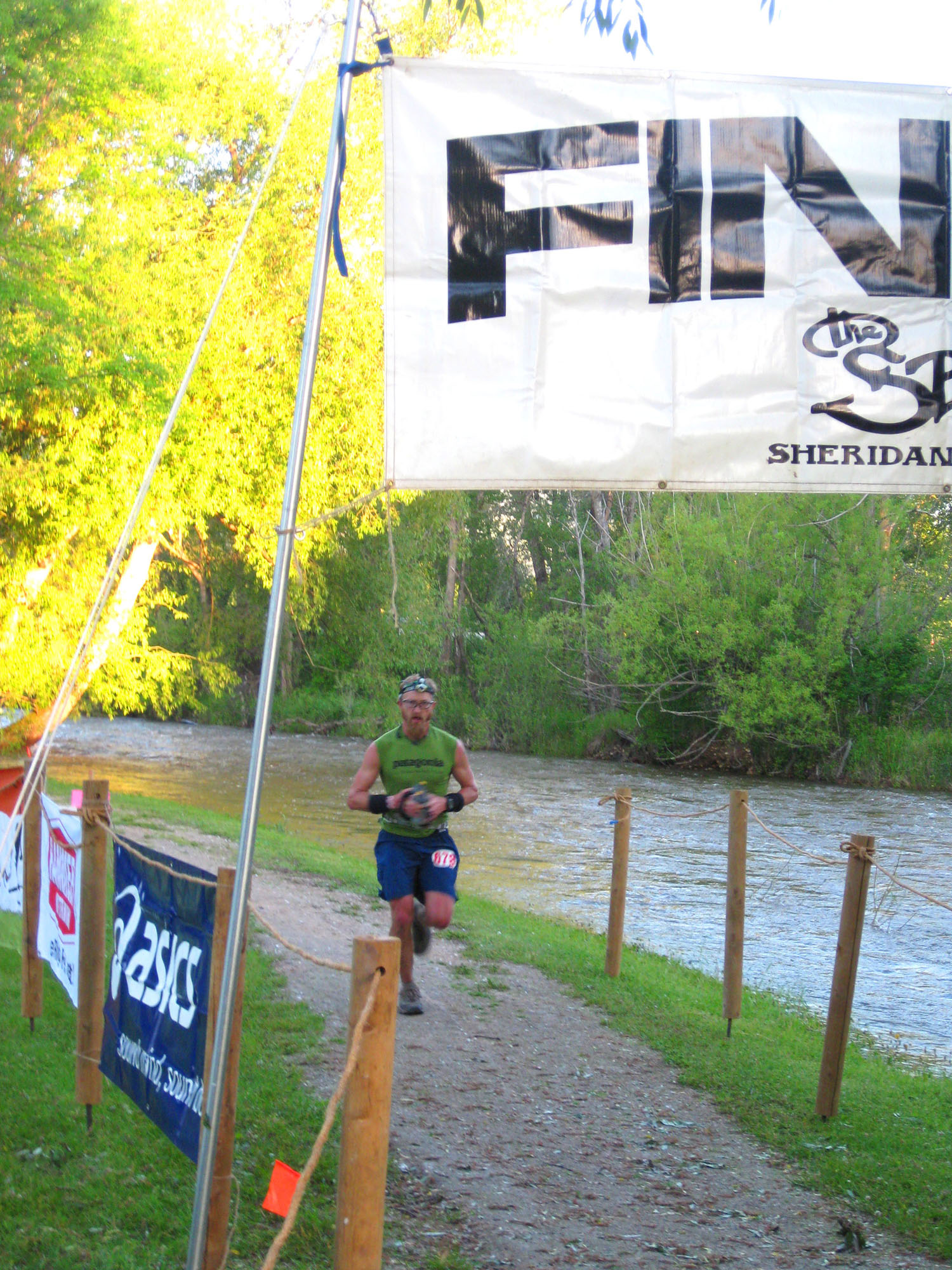 I came out, walked a minute and started looking at my watch and doing some quick math. I was REALLY close to breaking 19 hours. So, I decided, I would be mad at myself and regret it if I didn’t at least try to go sub-19. So, I backtracked my iPod to Freedom by Rage Against The Machine and just listened to it over and over (5-6 times) while I concentrated on leg turnover, posture, forward lean and cadence. I hit the paved street in town and was soon at the Bridge, I yeehawed, entered the park hootin’ and hollerin’ to see Jennifer standing there. As I rounded the path around the park, she cut across the lawn to the finish line and my kids and folks were there to celebrate with me as I crossed the finish line in 18:56:28! I’m super pumped to go 3 for 3 on this course!