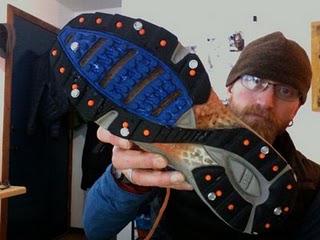 I just got back from an hour tempo run on hard packed snow with the set-up pictured below. It’s easy and way better than Yak Traks and they work fine on dry pavement if it gets patchy…just like spikes on an asphalt track (for you former track runners out there).