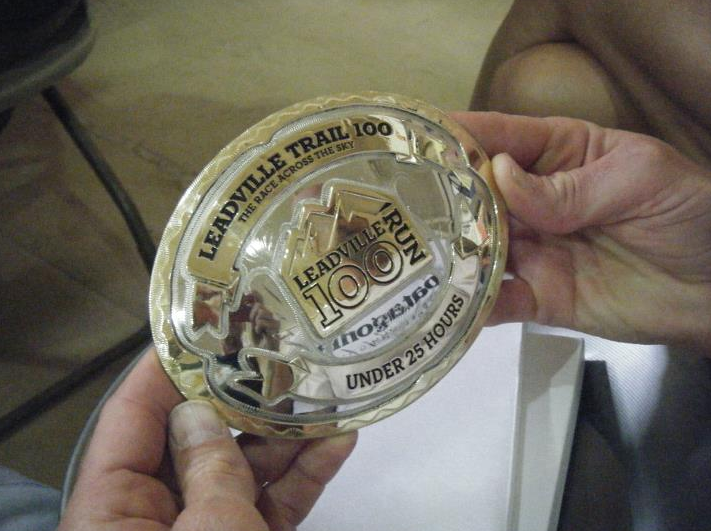 We were getting near the end of the Lake trail when Dave informed me he couldn’t keep up the pace anymore. So, he stuffed 3 gels in a pocket of my Ultraspire handheld and said “Go!” I left Dave and soon was on the road making the final slog back to town. This section is REALLY long. It feels like it takes forever. But, I soon was on the outskirts of Leadville and onto the pavement of 6th and topped the hill and could see the finish line. I crossed in 18 hours, 27 minutes for 5th place. Solid day, even though is wasn’t an “A” performance with the massive bonk I had over Hope, but all in all a good day. The buckle is HUGE. Leadville style. Giddyup.
