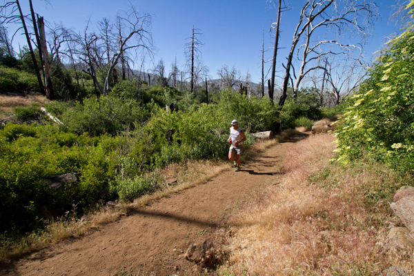 After Meadows, I kept running comfortably, letting the miles roll by and soon cruised into Rooster and got there right on CR splits. I got in and out with some banana and more water and was soon turning onto the Pacific Crest Trail (PCT), heading north. The heat was starting to hit here, because you start moving out of the tree cover and into the exposed shrubs that make up a majority of the upper course. I just kept plugging away and was soon through both Todd’s Cabin and Penny Pines a few minutes slower than CR pace.