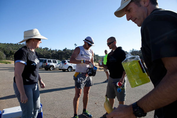 Rooster Aid Station, mile 13.8. Crewin' in style, George, gettin' me the goods on the drive-by. Photo by Krissy Moehl.