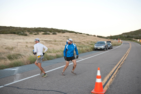Leaving Sunrise Aid at mile 80 with Allen Skytta at road crossing (one of the Seattle ultra homies). He gave me big hug and shouted, "Man, you're crushing it!" Photo by Stephanie Helguera.