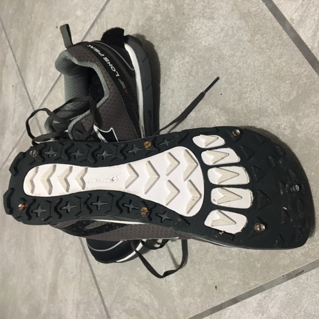 Each shoe pattern is different, so you have to get creative, but general placement is 5 in front (horseshoe pattern) and 2-3 in back (triangle pattern). Don’t place any in the middle where the main contact weight of your foot strike will fall. I’m a mid-foot striker and only put 2 in the very back. However, if you are a hard heel striker, I would maybe place 3 in the very back of the heel vs. two for a little more grip. Make sure you check your pattern periodically, as you may loose one sometimes. We run a lot of trail, even in winter in Central Oregon and the rocks will catch and pull the screw out sometimes. But, not a big deal, get home and throw another in with your handy powerdrill.