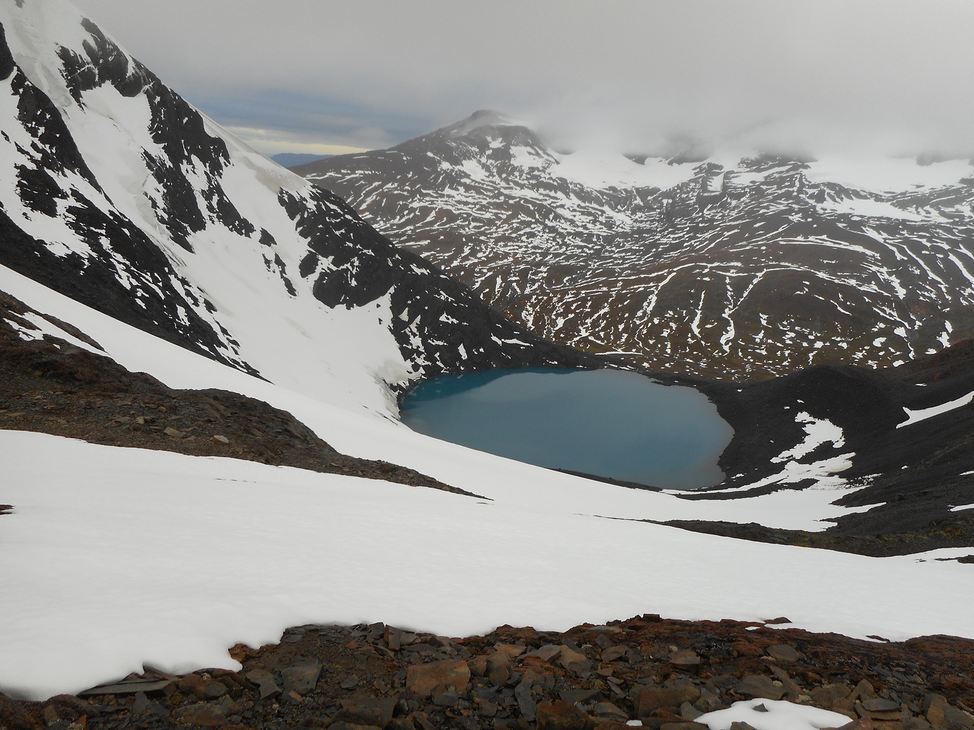 I took off traversing the saddle before the route descends a steep snow slope down onto the glacier. I pulled my jacket over my rear and plopped down onto the snow to glissade down the steep incline. This is where I ran into the unmarked crevasse. Bam, I just got up off my rear to step across it. That was close. After I got across it and up and over the class 3 scramble, the course markers started to get hard to find, they were spread out and some clouds were moving in to cause a little fog. I stood on the saddle above a moraine lake trying to see which way to go. Finally I spied a blue marker down by the lake. I plunged off the saddle toward the lake.